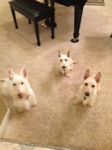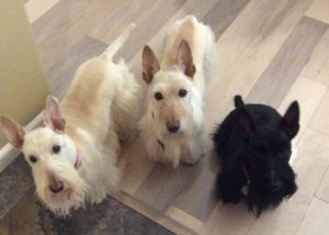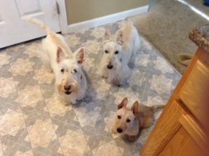 It was nice having our sister, Sunny, to watch over us for many years because she was seven years older than us and she was kind of like having our own doggie mom. When little Sadie came along five years ago, Sunny showed her the ropes too and we were a tight little family of four Scotties until last September, when Sunny suddenly became very ill and we lost her because of a splenic tumor, which left me with my two sisters, Molly and Sadie.