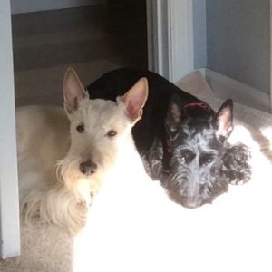 Here we are at home, just as we normally are, but Wen is not out and about anymore and she is here with us all day long now. Since we Scotties don’t have the worries of coming down with Covid-19, we are living as usual. Sometimes, we snuggle up to take a nap, but most of the time, we like our own space and we practice the social distancing that is recommended for people right now. Wen may be busy cleaning and disinfecting, but we Scotties are busy hanging out, keeping her company, and doing our regular routine.