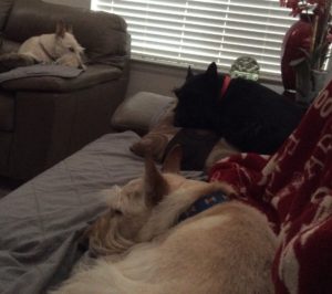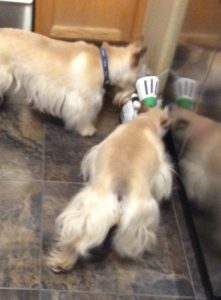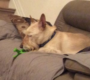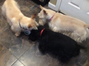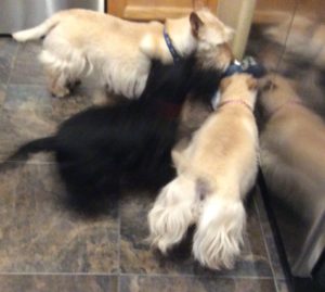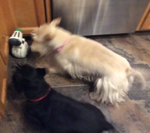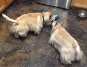 My two sisters absolutely love their hard rubber chew toys. Both Molly and Sadie can be found gnawing away on the many toys that Wen has provided for us multiple times each day. I, on the other hand am more of a licker. I like to lick the floor, the carpet, pillows, quilts. my crate pad, and even the kitchen floor. My licking sort of drives Wen crazy, especially when Molly and Sadie see me vigorously licking on something and they copy me and join in. That’s usually the point when Wen puts a stop to the lick fest.