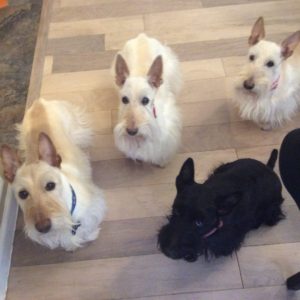 Nobody loves grooming day more than Wen. Every day, she brushes our teeth and our haircoats, but on grooming day, she gives us Scotties a super good brushing and then loads us into the car for our trip to go see Gigi, our groomer.