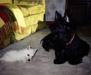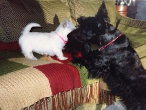 Duffy was an easy going gentleman Scottie and Corky was a little pistol. Even though Duffy seemed like a giant, compared to Corky, she had so much spunk that she challenged her older brother for every toy with absolutely no fear. The size difference didn’t seem to matter at all and although Corky was tiny at that point, she made up for her small size with her big personality and Duffy, who had grown up with much older dogs, enjoyed romping around with his little buddy, who led him on a merry chase every day. As Corky grew, so did her friendship with Duffy and the big dog and the little puppy became inseparable best friends for life.