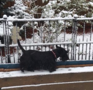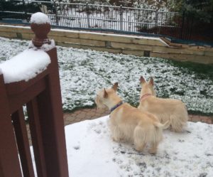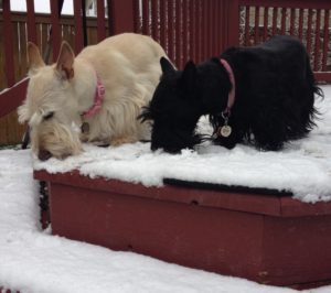 Between snowstorms and upcoming hailstorms, we are enjoying nice spring weather. What do we Scotties do on pleasant sunny days? We go cruisin’ around our backyard. You bunnies and squirrels better look out! We Scotties are on patrol!