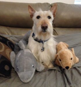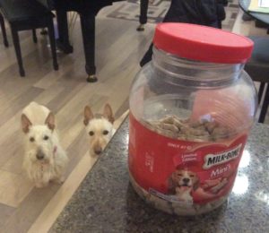 There is one thing in our house that all four of us Scotties absolutely love. We notice when it moves from its spot on the kitchen counter and when it rattles, we come running. What is it? Our beloved treat jar, the large plastic jar that holds our Milkbones. The sound it makes when Wen picks it up and shakes it is magnificent and every time we hear those mini Milkbones rattling around inside, we run to the kitchen counter and line up for a tasty treat. Is there a more magical sound? I don’t think so!