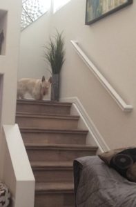 My sister, Sunny, has recently become obsessed with getting into the bathroom trash and strewing tissues and paper towels all over the bedroom carpet. Needless to say, Sunny’s habit has not been very popular with Wen, who has to continually clean up the messes. When no one is paying attention, Sunny will sneak up the steps and paw at the bathroom cabinet until she gets the door open and she can stick her nose into the trash. One time I noticed her sneaking off, so I decided to follow her to see what was up and when I saw her get into the the trash, I thought that I could do that! So I waited for what seemed like a good time and I went sneaking up the steps, only to get to the landing and hear “Riley! Where are you going?!” Bummer, wouldn’t you know, I got busted! I guess that I’m not as good a sneaker as Sunny.