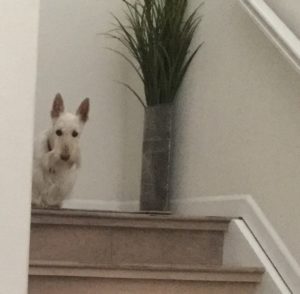 Just when you think that this is a blurb about athletic shoes, think again! I’m talking about Scotties who go sneaking off to be up to no good and in our house, that usually involves the upstairs bathroom trash can.