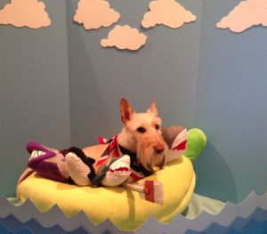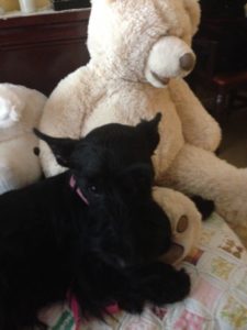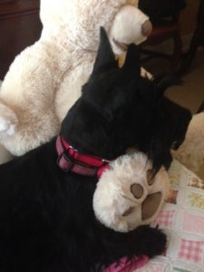 On one recent visit, there was a big teddy bear on the bed and Sadie found herself a nice soft snuggle buddy, to Wen’s friend’s delight.