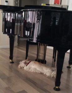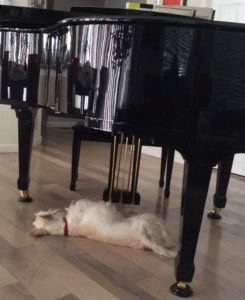 We Scotties enjoy hearing Wen play the piano, but other than when it’s being played, we don’t pay any attention to it. Even though the piano takes up a huge part of our living room, we pretty much ignore it, other than to walk around the enormous roadblock or walk underneath it as we’re passing through.