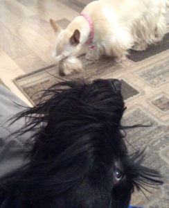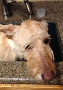 The other night, Wen was busy in the kitchen, making all kinds of preparations for something. The next thing I knew, I was sitting in the sink getting a bath. The warm water from the hose felt good, so I didn’t try to escape. I just sat there, getting a shampoo and rinse. Before long, Wen towel dried me and I was running around with all three of my sisters chasing me.