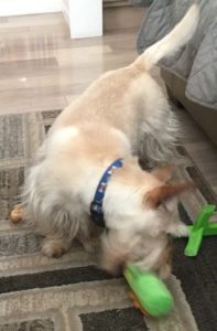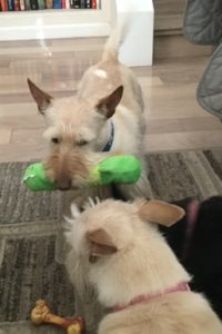 I got a new gator toy and it’s a crunchy toy–my favorite! I haven’t had a new gator toy in what seems like forever and this one is special, because it has two different sounding squeakers and a crunchy bottle inside too, which means a variety of chomping fun times for me!
