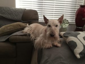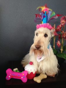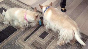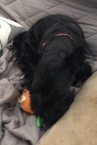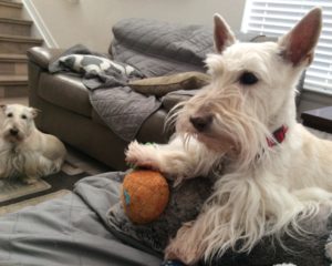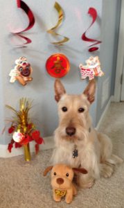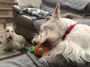 We Scotties got the neatest Christmas present from Wen’s cousin. It’s a BarkBox subscription and every month, a box of nifty dog toys and treats arrives for us. We have thoroughly enjoyed snarfing up the delicious doggie treats and we have had crazy fun times playing with the toys.
