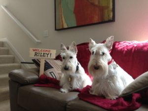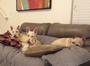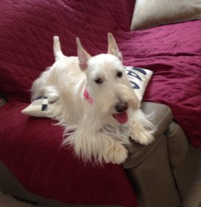 Things changed when they moved to our present house. The living room furniture was brand new and Wen decided that the couch and love seat were “no Scottie zones.” That only lasted a few weeks though, because the Scotties were used to lounging on the furniture and Wen grew tired of constantly chasing them off. She went out and bought quilted couch protectors and as soon as they were installed, all three Scotties staked their claims on the furniture that had been off-limits. (Score one for the Scotties!)
