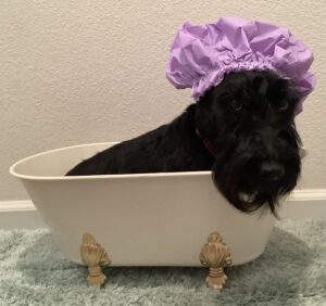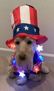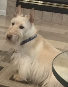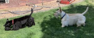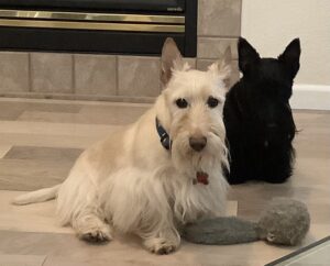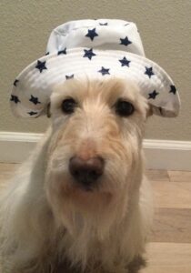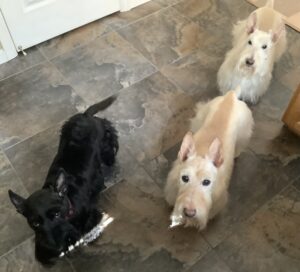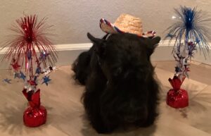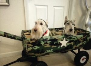 Back in the day, the Rocky Mountain Scottish Terrier Club had an annual Halloween party. Members were invited to bring their Scotties and dress them in Halloween costumes for a parade of Scotties. Prizes were given for the best costumes and one year when I was just a pup, Wen decorated our wagon to look like a tank and she made camouflage outfits for Kirby, Sunny, and me. We had hats, shirts, and even dog tags with our names to wear with our costumes. We Scotties practiced riding in the tank (wagon) in our costumes and Wen was confident that we would be fine riding around in the parade.