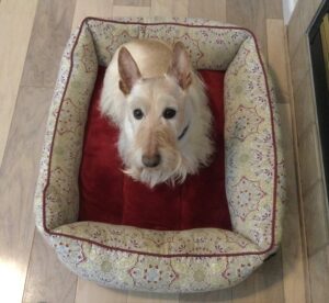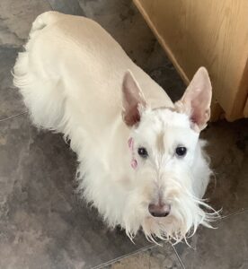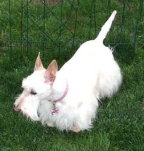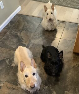 Yesterday was grooming day and when we got back home, we Scotties patrolled the backyard. While we were out there cruising around, the skies began to darken, you could hear thunder off in the distance, and the wind kicked up. As a matter of fact, our beards were blowin’ in the wind and since the weather looked threatening, Wen herded us back inside. No use in risking ruining our freshly groomed haircoats!