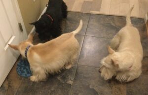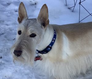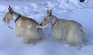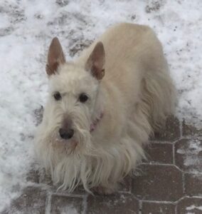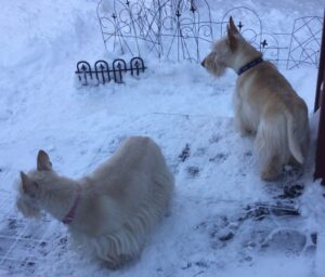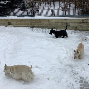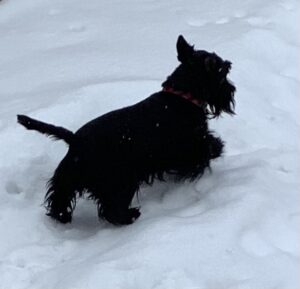 Who is the main snowplower? That would be me, because I am the most adventurous and being the only male, the biggest of our crew. Little Sadie sometimes hops her way through the snow, but Molly usually follows in my tracks. After few times around the yard though, we create our own Scottie traffic patterns to serve us until the snow melts.