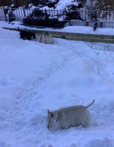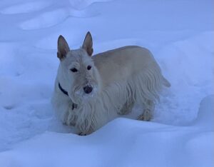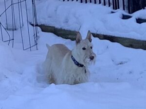 It may be cold outside, but we Scotties are lovin’ the snow. After last week’s 15 inches plus the snow from the last two nights, we have quite an accumulation in our yard, thanks to frigid temperatures. At least the sun is out today, but it doesn’t really matter if it’s sunny or cloudy, because we Scotties will be out there making tracks regardless. Yep, we love the snow!