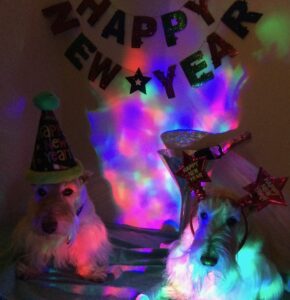 Wen took this festive picture of Molly and me, but Sadie didn’t want to have anything to do with the colorful lights, so she took off to the farthest part of the house. As soon as the lights were gone though, she was back, so all three of us wish you all the best. Happy New Year!!!