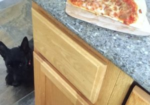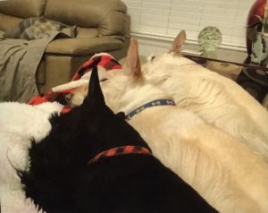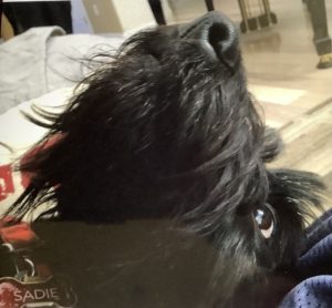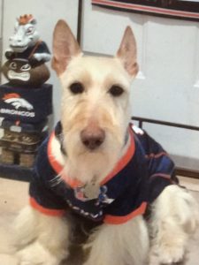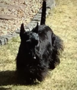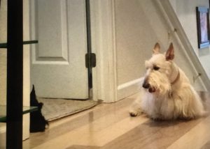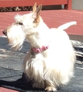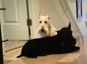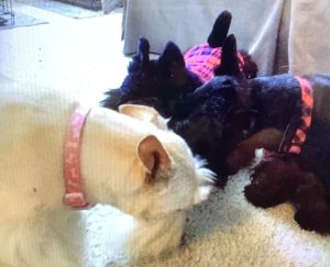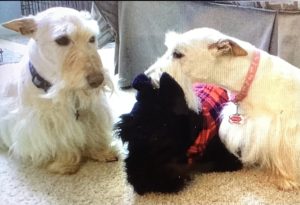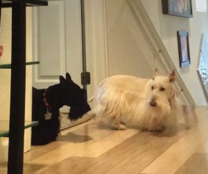 Later, when Wen walked into our house with the plush guy, Molly, Sadie, and I were curious and when she set him on the floor, we naturally had to check him out, so we sniffed all over him and even poked at him with our noses until we determined that he was a plush toy addition to our Scottie family and not a new living breathing dog. Nothing like a big plush surprise to capture the attention of us three inquisitive Scotties!