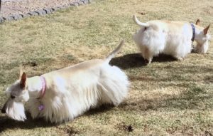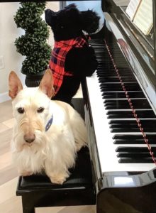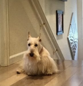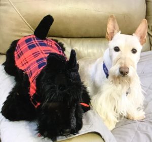 So when Wen went to play pickleball with her friends yesterday, she got a really nice surprise from one of the gals. As a matter of fact, it was a big plush surprise, a life-sized plush Scottie with a red plaid coat that her friend, Karen, had found. She thought that it would be fun to see how we Scotties reacted to the plush toy, so when she saw the Scottie at the thrift shop in perfect condition, she bought it for Wen, who of course thought that the Scottie was the best surprise ever.