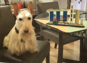 What happens on snowy winter days at our house? The Legos come out and Wen builds interesting miniature architectural projects. Each Lego set contains bags of tiny plastic pieces that are, of course, very fascinating to us Scotties. We hang around the table where she works on her Lego projects and if a piece should happen to fall onto the floor, we are ready to pounce on it, so she has to be really quick to grab a piece off the floor before one of us could swallow it.