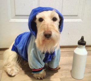 It’s nice outside and since I was recently given a warmup jacket that someone donated to Scottie rescue, it’s time to get some exercise. The water bottle is filled and my short little legs could use a good workout, so let’s go for a run!