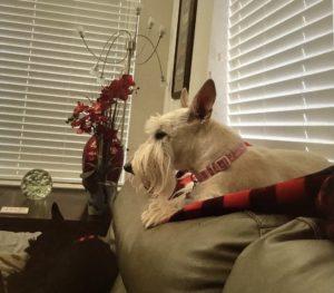 Since Sadie first made herself at home on the back of the couch, she has been spending a lot of time up there. Evidently, she’s not the only one of us Scotties who has been inspired to jump up and stretch out up there, because once Molly noticed Sadie jumping to new heights to make herself comfortable, she had to try it also. Who would have thought that Molly would ever imitate anything that Sadie does, but just like monkey see, monkey do, at our house, it’s Scottie see, Scottie do and now Molly is also enjoying relaxing at new heights.