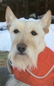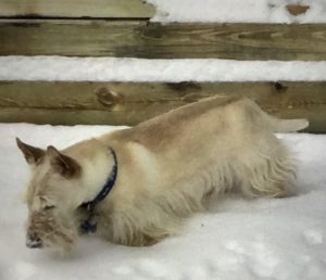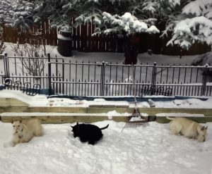 It’s Groundhog Day, but here in Denver, no groundhog is going to see his shadow. It started snowing yesterday afternoon and it’s still snowing. While Wen cleared the snow from our deck, we Scotties explored the conditions in our backyard and so far, we have just made one path to the area that is most protected underneath a big blue spruce tree. I’m sure that later on, we’ll start plowing our usual circle around the yard, but for now, we’re enjoying the warmth from the fireplace until our next trip outside. Groundhog Day is definitely a snowy day this year and we Scotties are “walking in a winter wonderland!”