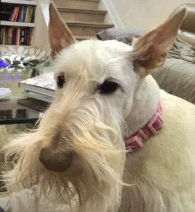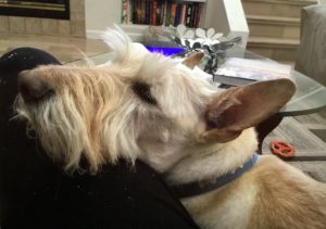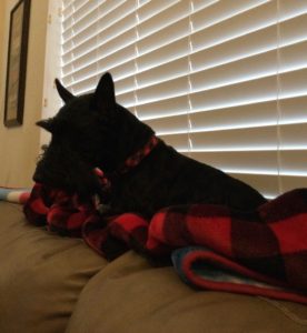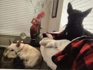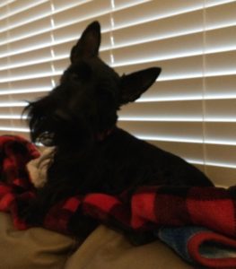 I’ll admit it—I’m a snuggler. Lots of Scotties prefer to keep their distance and would never be caught snuggling up to their favorite person on the couch, but that’s not me. Every time Wen sits on the couch, it’s only a matter of time until I jump up beside her and scooch up right next to her and sometimes I rest my head on her and use her for a pillow. Evidently she doesn’t mind that I like to snuggle, because she says that I’m the first Scottie out of eleven who has been a snuggler and she seems to like it, even when I fall asleep on her or next to her. Guess there’s nothing wrong with being a snuggler Scottie!
