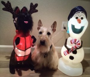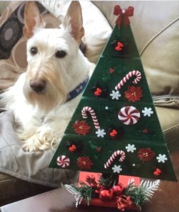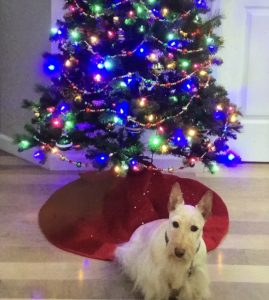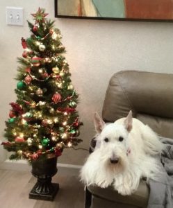Yep, the tree’s up and although it doesn’t smell like a real tree, it’s still tempting to us Scotties to have a tree conveniently located in our living room, so I’d better be on my best behavior!