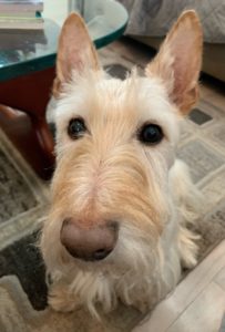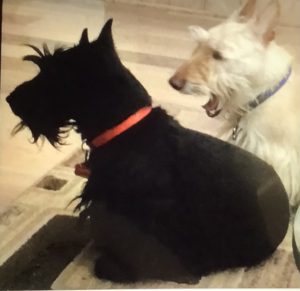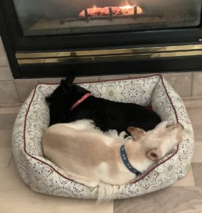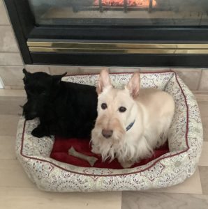 Early this morning when we Scotties went outside, it was actually cold! Since we’ve not switched from AC to the furnace yet, Wen decided to turn on the fireplace to warm up the living room. All it takes is a chilly fall day and a blazing fire and Sadie and I are back in front of the fireplace. Yep, we two fireplace buddies like to camp out on our dog bed and soak up the warmth.