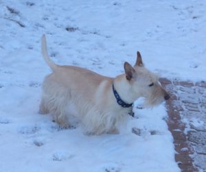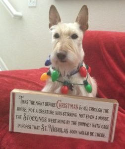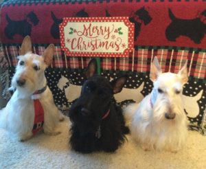 Three Scotties and one dog bed can create some power struggles. When the bed is in front of the fireplace, where we can feel the warmth, that dog bed is especially appealing and you can find either Sadie or I occupying it. We normally switch off lying in the bed, but sometimes, both of us share the bed, but only if we are both in a good mood.
